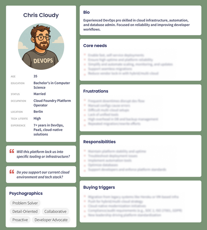 When I joined a cloud platform startup, the team lacked a structured understanding of their B2B audiences, relying on vague labels like “User” and “Buyer.” I built an evidence-based persona system from the ground up by auditing internal knowledge, conducting external research to define the ICP, clustering personas using a strategic framework, and validating with stakeholders — aligning product and marketing around real decision-makers and enabling more targeted messaging.